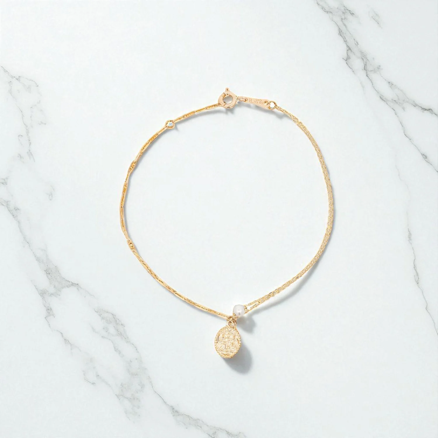 Κομψό χρυσό βραχιόλι 14 καρατίων με κωνσταντινάτο μενταγιόν και φίνο λευκό μαργαριτάρι, που συμβολίζει πίστη, προστασία και διαχρονική ομορφιά. Η αλυσίδα, με τον ξεχωριστό συνδυασμό κρίκος-κρίκος και πλέγμα, προσφέρει μοντέρνα αλλά και παραδοσιακή αισθητική.